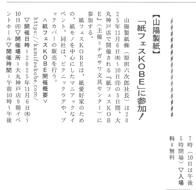 令和7年10月25日発行の旬刊包装産業に、11月6日から開催される「紙フェスKOBE」へ出店する旨が掲載されました。