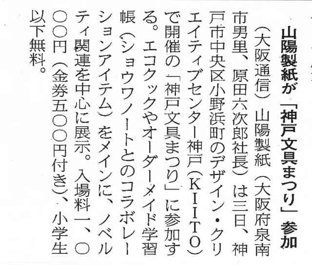 令和7年12月1日発行の日刊紙業通信に、山陽製紙が神戸文具まつりへ出展することが掲載されました。