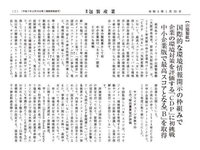 令和8年1月25日発行の旬刊包装産業に、山陽製紙が国際的な環境情報開示の枠組みで企業の環境対策を評価する「CDP」に初挑戦し、中小企業版で最高スコアとなる「B」を取得