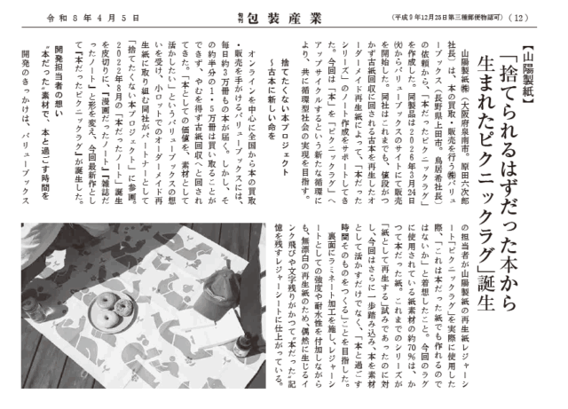令和8年4月5日発行の旬刊包装産業に、山陽製紙が「本だったピクニックラグ」を作成したことが掲載されました。